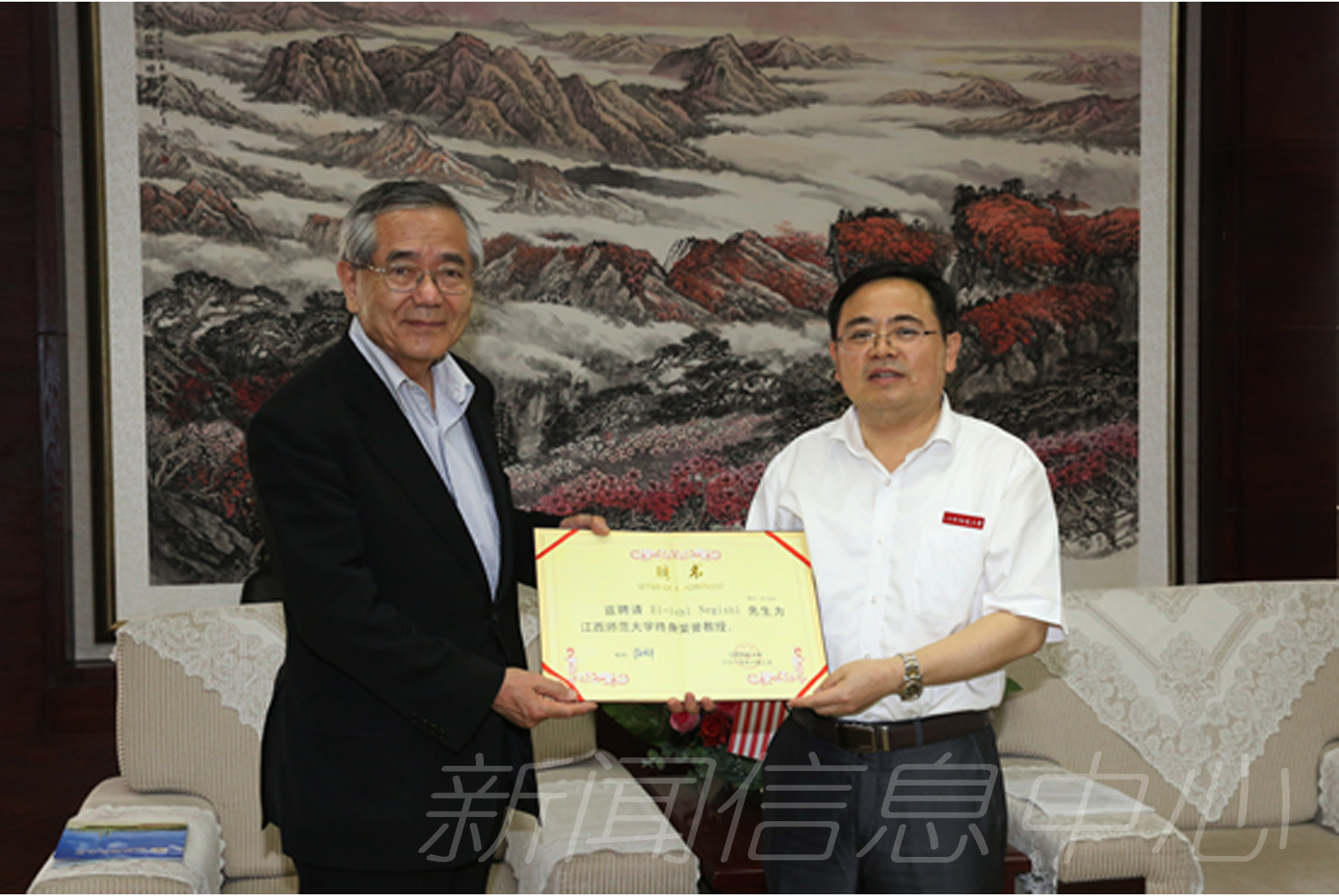 Ei-ichi Negishi教授感谢学校的热情接待,愉快地接受了学校的聘任。他说,这是第一次来江西、来江西师大,江西优美的风景、纯朴的民风、快速的发展给他留下了深刻印象,师大校园有活力、师生有朝气、学科有特色、科研有成绩、平台有保障,江西的发展、师大的前行步伐一定会加快,并表示在有限的时间内非常愿意再来江西、再来师大,也一定会力所能及地给予师大更多的关心和指导。