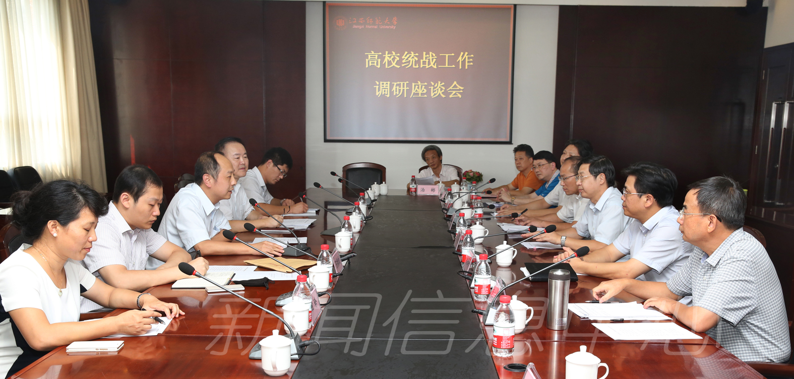 9月10日下午,中央统战部六局副局长张明一行在省委统战部副巡视员杨建平及相关处室负责人陪同下到我校调研指导高校统一战线工作。校党委书记田延光、校长梅国平、党委副书记聂剑在知行楼第一接待室会见了调研组一行。