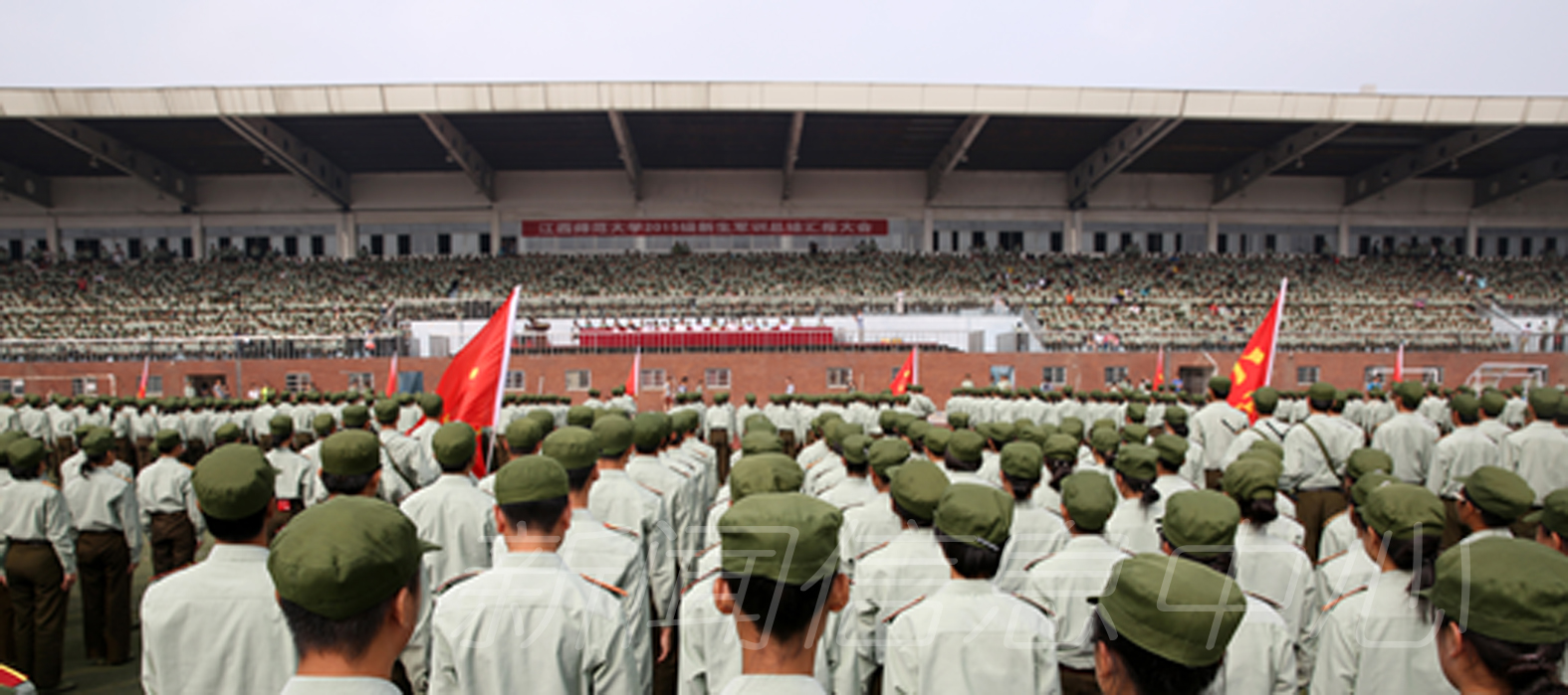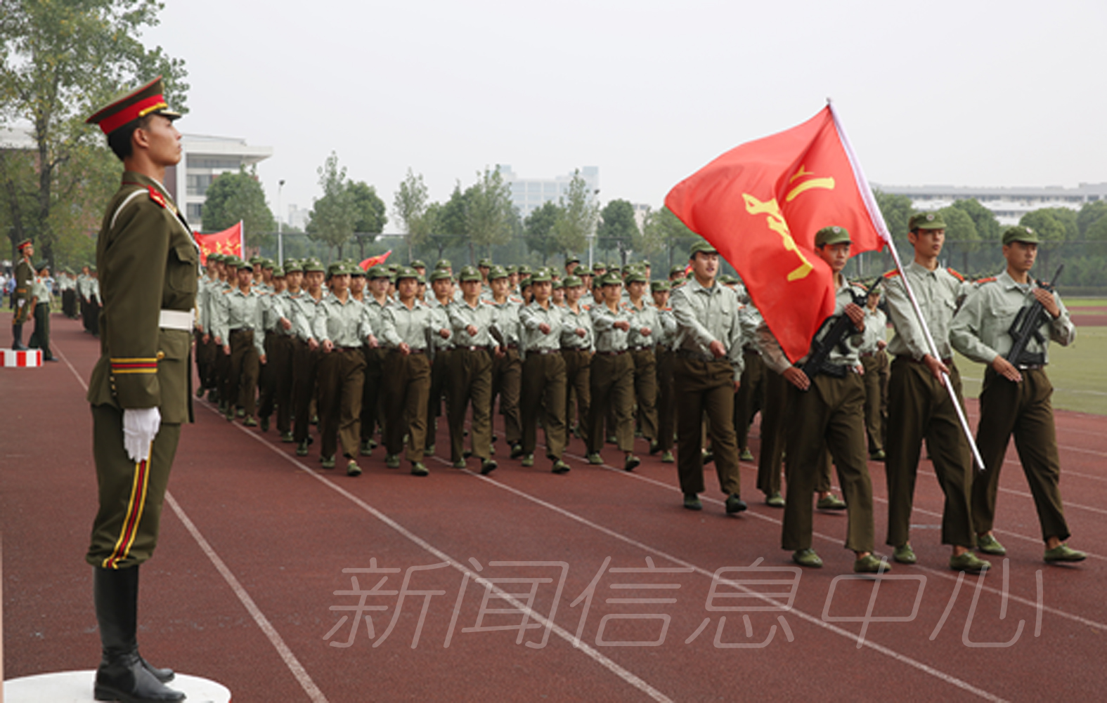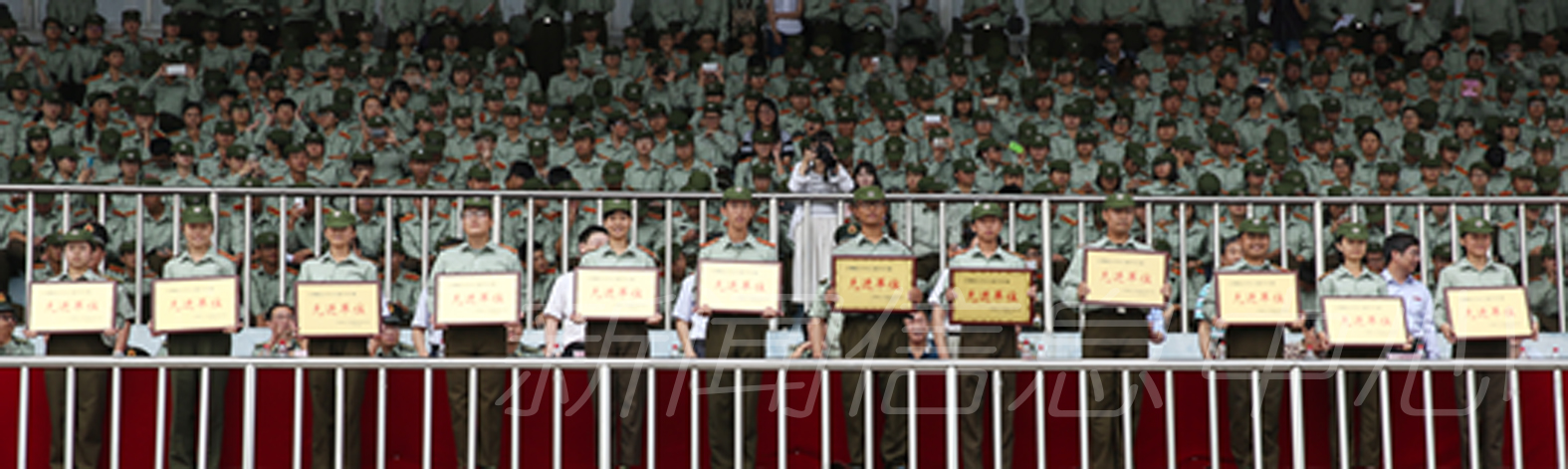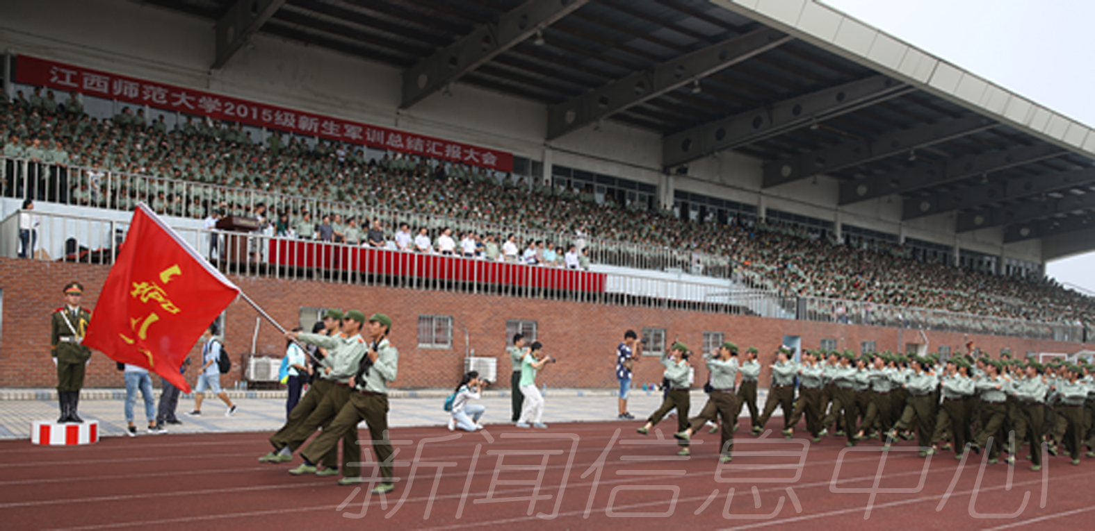 9月26日上午,我校新生军训总结汇报大会在瑶湖校区长胜体育场隆重举行,2015级全体新生用辛勤汗水交上了大学生活第一份令人满意的答卷。武警总队江西省第一支队参谋长张硕木,校党委书记田延光,副校长张艳国、项国雄,纪委书记贾俊芳,校长助理丁晖等出席大会并为军训受表彰先进集体和个人颁奖。相关职能部门负责人、名学院党委副书记、2015级新生辅导员和全体新生参加总结汇报大会。大会由项国雄主持。