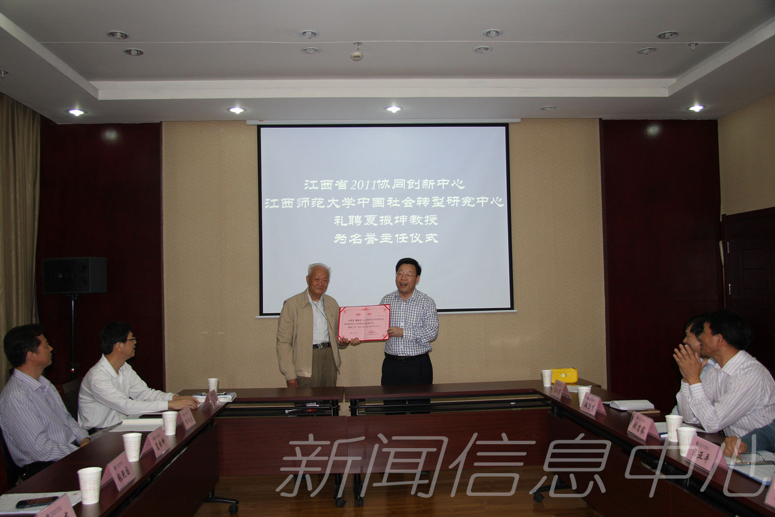 近日,江西省2011协同创新中心江西师范大学中国社会转型研究中心礼聘当代著名经济学家、湖北省首届荆楚社科名家夏振坤研究员为名誉主任仪式在湖北省社科院举行。仪式由华中师范大学中国近代史研究所所长朱英教授主持,我校副校长张艳国教授介绍了中国社会转型研究中心的情况并向夏振坤研究员颁发了聘书。