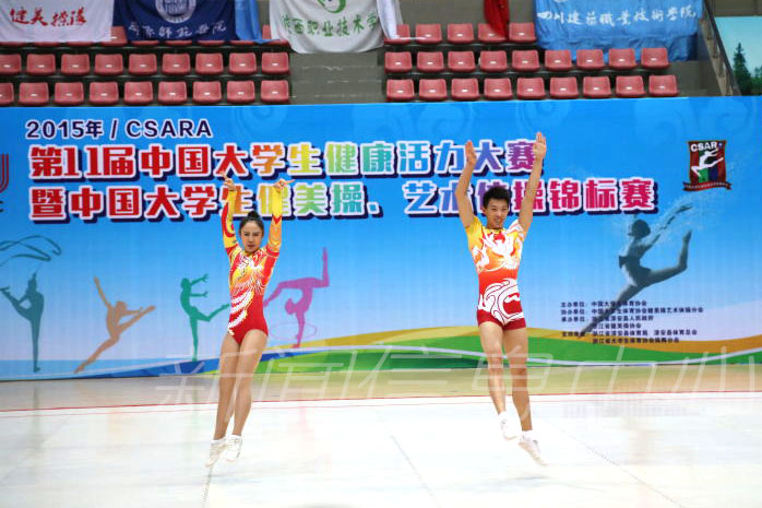 近日,2015年CSARA第11届中国大学生健康活力大赛暨中国大学生健美操、艺术体操锦标赛在浙江省淳安县圆满落幕。来自北京大学、清华大学、北京师范大学、同济大学、华东师范、浙江大学、台湾台北市立大学等26个省市地区87所高校的1200多名运动员参加了16个项目的争夺。经过激烈竞争,我校代表队共获5金3银1铜,分别是大学生高水平组男子有氧舞蹈冠军,混合双人操冠军、亚军和单人操亚军,女子三人操冠军以及混合三人操冠军;体育表演系学生获得了体育院校B组女子五人操冠军、男子五人操亚军和女子三人操季军。特别是我校高水平男子单人操和混合双人操均突破了20分,这是该项目近年来难得的高分,表明了我校这两个项目在全国居于领先水平。(文/图 体育学院)