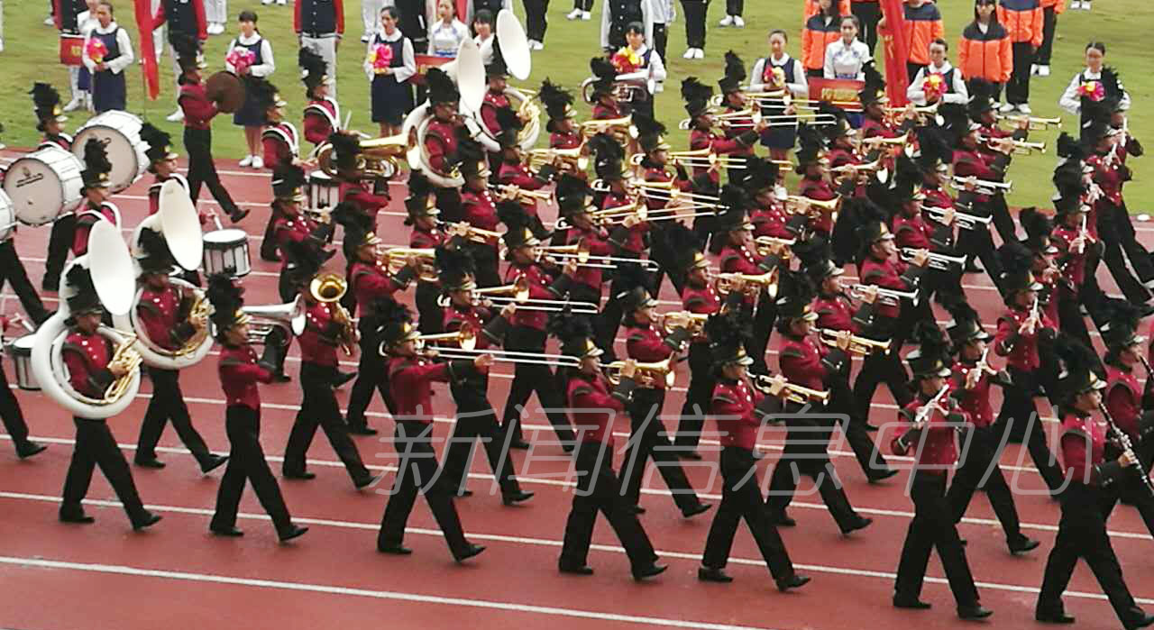 在校女子军乐团伴奏的国歌、校歌声中,国旗、校旗、会旗先后升起。