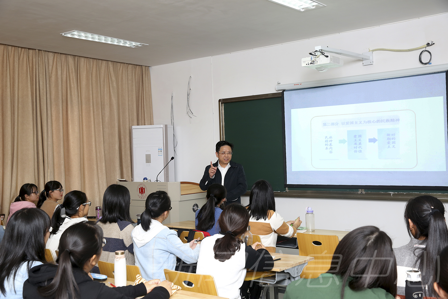 “习近平总书记在十九大报告中强调要大力弘扬民族精神和时代精神。通常讲,爱国主义是民族精神的核心,改革创新是时代精神的核心,请同学们思考为什么这样讲?”梅国平以问题导入,启发同学们思维。然后,结合学校实际,特别是结合“抗战捐躯教授第一人”——我校姚名达教授徒手搏斗日寇殉国的英勇事迹和刚刚在美国纽交所上市的趣店集团总裁——我校2004届物理与通信电子学院校友罗敏的创业经历,强调了爱国、创新对于当代大学生成长成才的特殊意义和重要性,勉励同学们要见贤思齐、心系祖国、勤奋努力、敢于创新、奋发有为,做一个有“精气神”的师大学子和时代骄子。