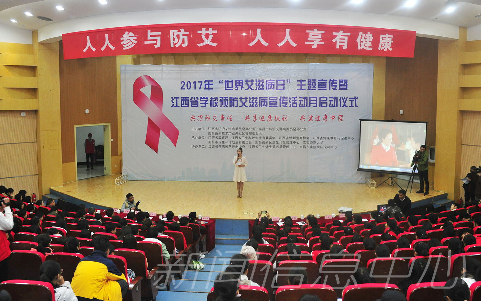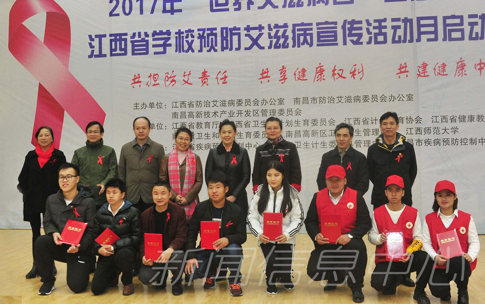 12月1日上午,2017年“世界艾滋病日”主题宣传暨江西省学校预防艾滋病宣传活动月启动仪式在我校音乐艺术广场报告厅举办。江西省卫计委副主任万筱明,副校长姚弋霞,江西省卫计委疾控处、江西省计生协会、江西省疾控中心、江西省健康教育与促进中心、南昌市卫计委、南昌高新区社发局、南昌市高新区社发局等单位和部门相关负责同志出席并为艾防优秀志愿者颁奖,学生代表400余人参加了启动仪式。