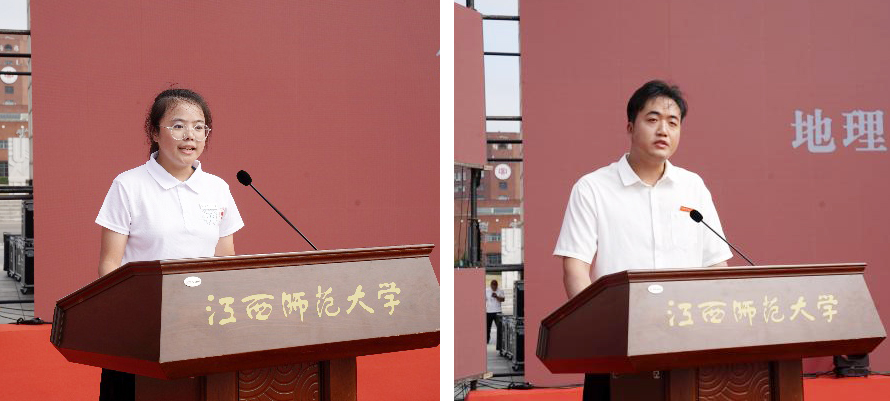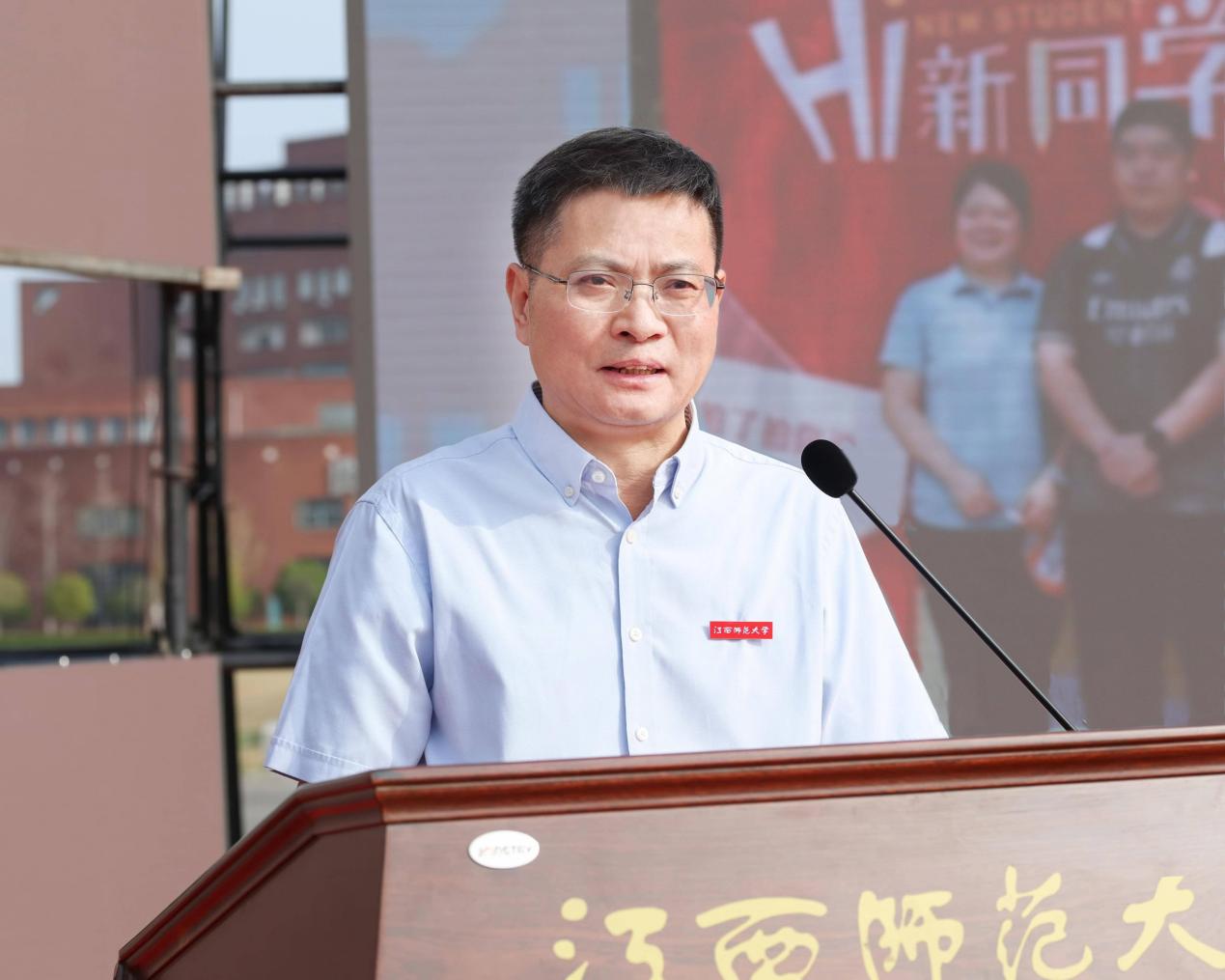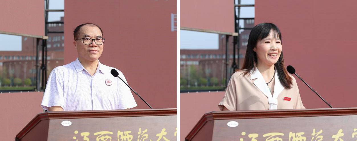 1984届化学系校友、和美药业股份有限公司董事长张和胜,教师代表、新闻与传播学院教授、博士生导师袁爱清,新生代表公费师范生院2025级英语专业本科生熊雅文、地理与环境学院2025级地理学专业博士研究生年柏翰先后发言。