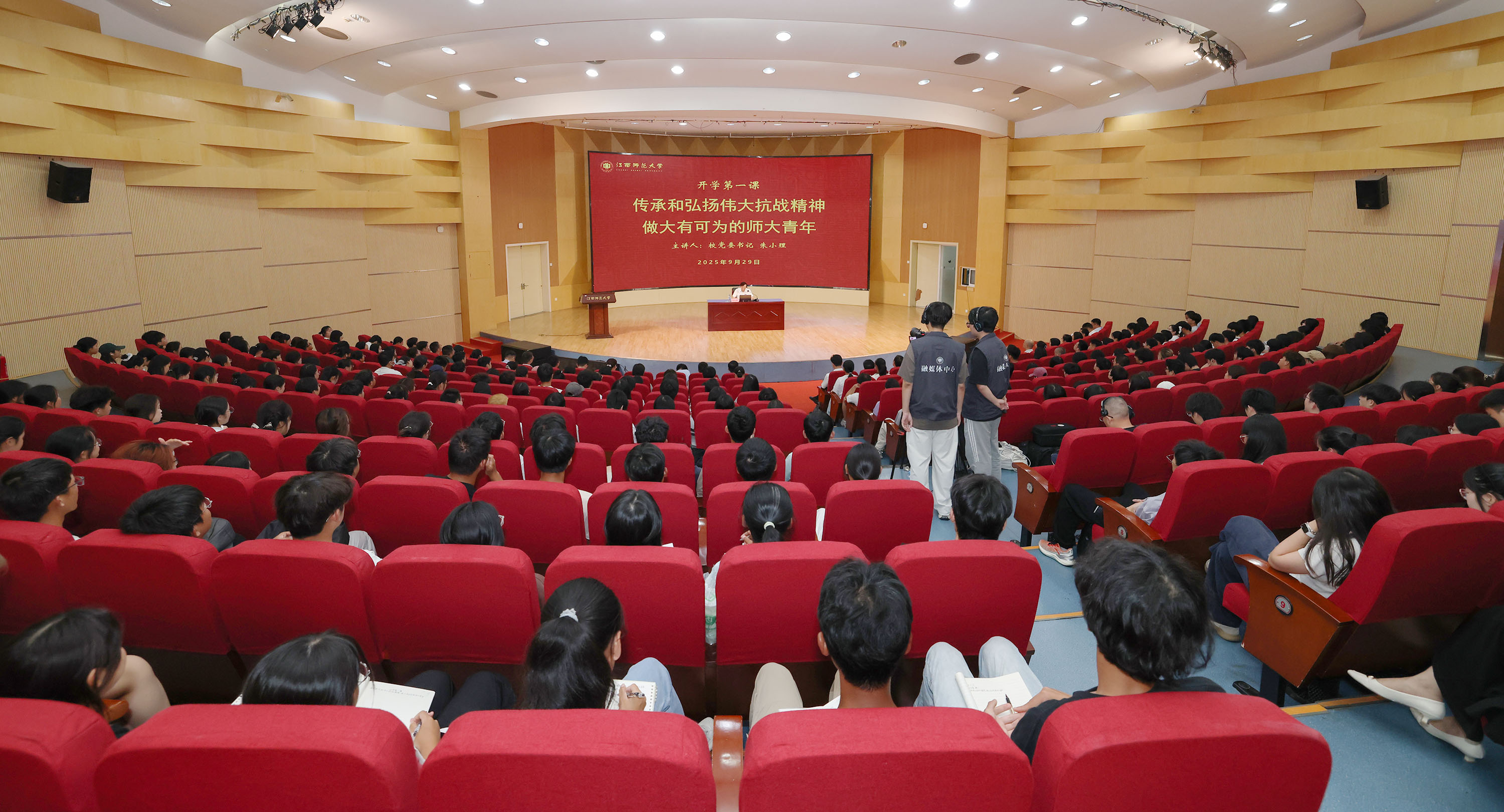 9月29日,校党委书记朱小理在瑶湖校区音乐艺术广场报告厅以“传承和弘扬伟大抗战精神 做大有可为的师大青年”为题讲授“开学第一课”。校党委常委、副校长董圣鸿主持授课报告会。校党委常委、宣传部部长王一喜以及学校相关职能部门主要负责同志、学工干部代表、本科生代表、研究生代表共300余人现场聆听。